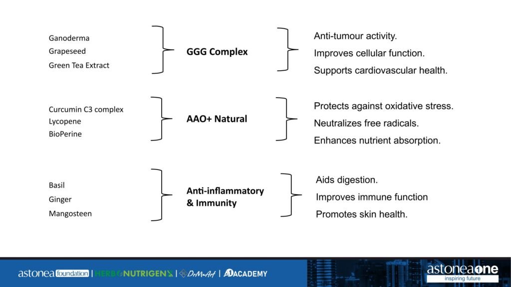 Ganoderma, Green Tea, and Grape Seed Extract & mdash create a synergistic effect that enhances the body &rsquos defense against cancer by targeting multiple molecular pathways, including antioxidant activity, anti-inflammatory effects, and tumor growth inhibition.